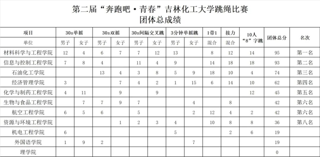 最终信息与控制工程学院凭借日夜训练的沉积荣获跳绳比赛团体总成绩第二名的优异成绩。